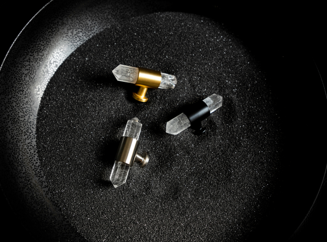 Born of igneous rock and geothermal aquatic environments, authentic crystal quartz gleams in the light. Individual spectral veins and natural bubbles come together to form an abstract pattern unique to every piece, Aura embraces the random formations of nature, while being grounded on a modern base.