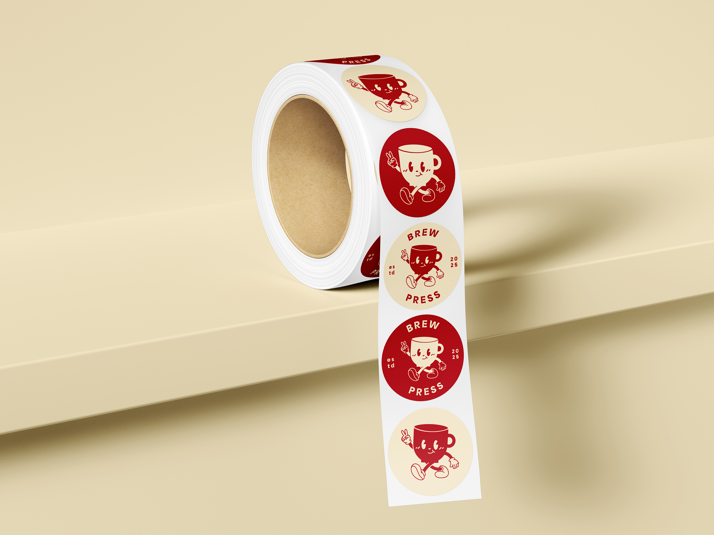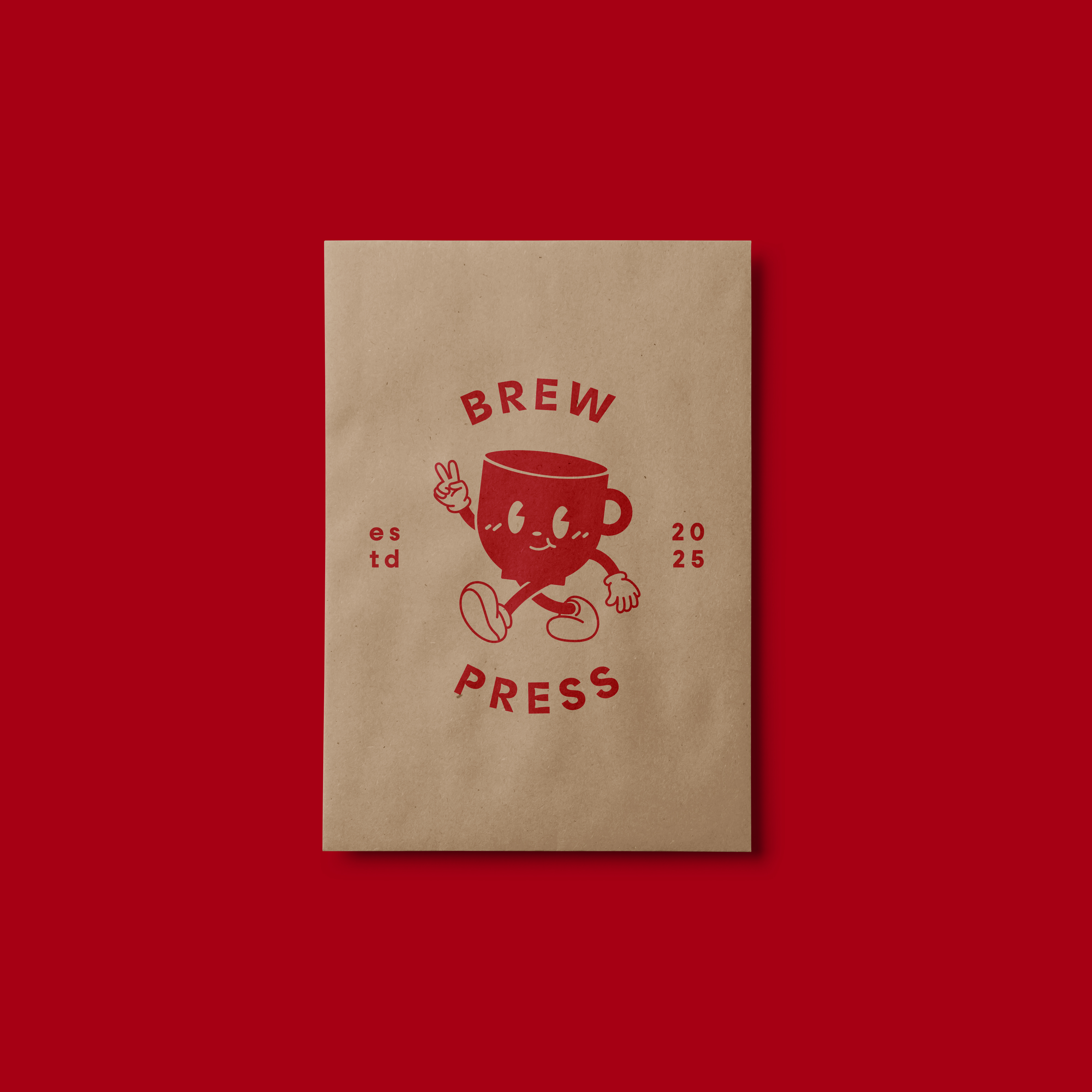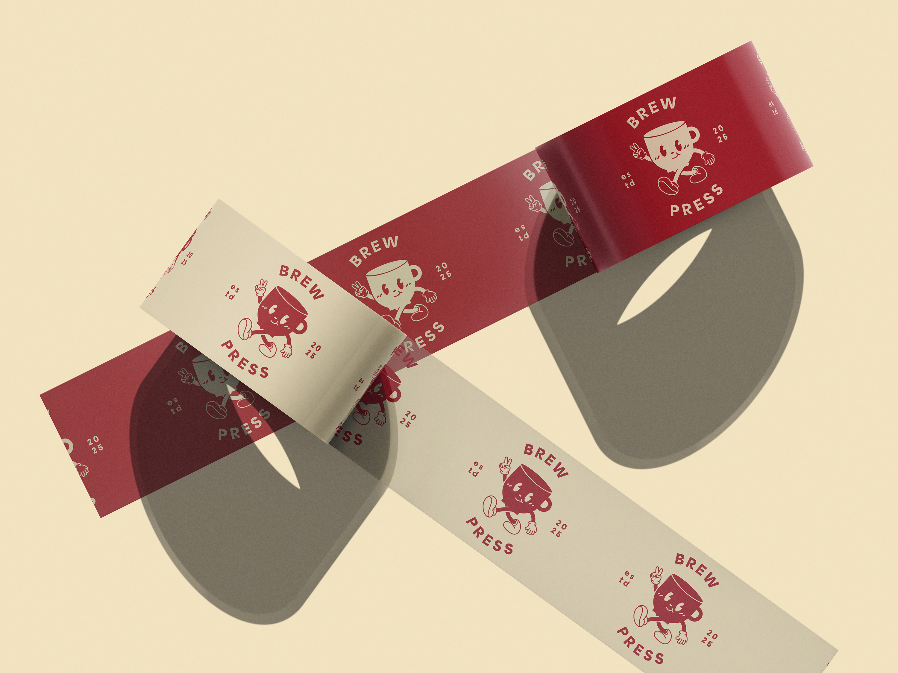 To accommodate the diverse range of deliverables Brew Press provides to its clients, a unified suite of branded packaging was developed. This included custom-branded packaging tape, mailers, stickers, and paper bags, all designed to reflect the brand's playful yet professional identity. The packaging prominently features the signature red and cream color palette, paired with the mascot logo to ensure immediate brand recognition. Each element was designed with versatility and practicality in mind, balancing functionality with aesthetic appeal. From the bold, eye-catching tape used to seal shipments to the detailed sticker designs that add a personalized touch, every piece reinforces the thoughtful, handcrafted ethos of Brew Press while creating a memorable unboxing experience for its customers.