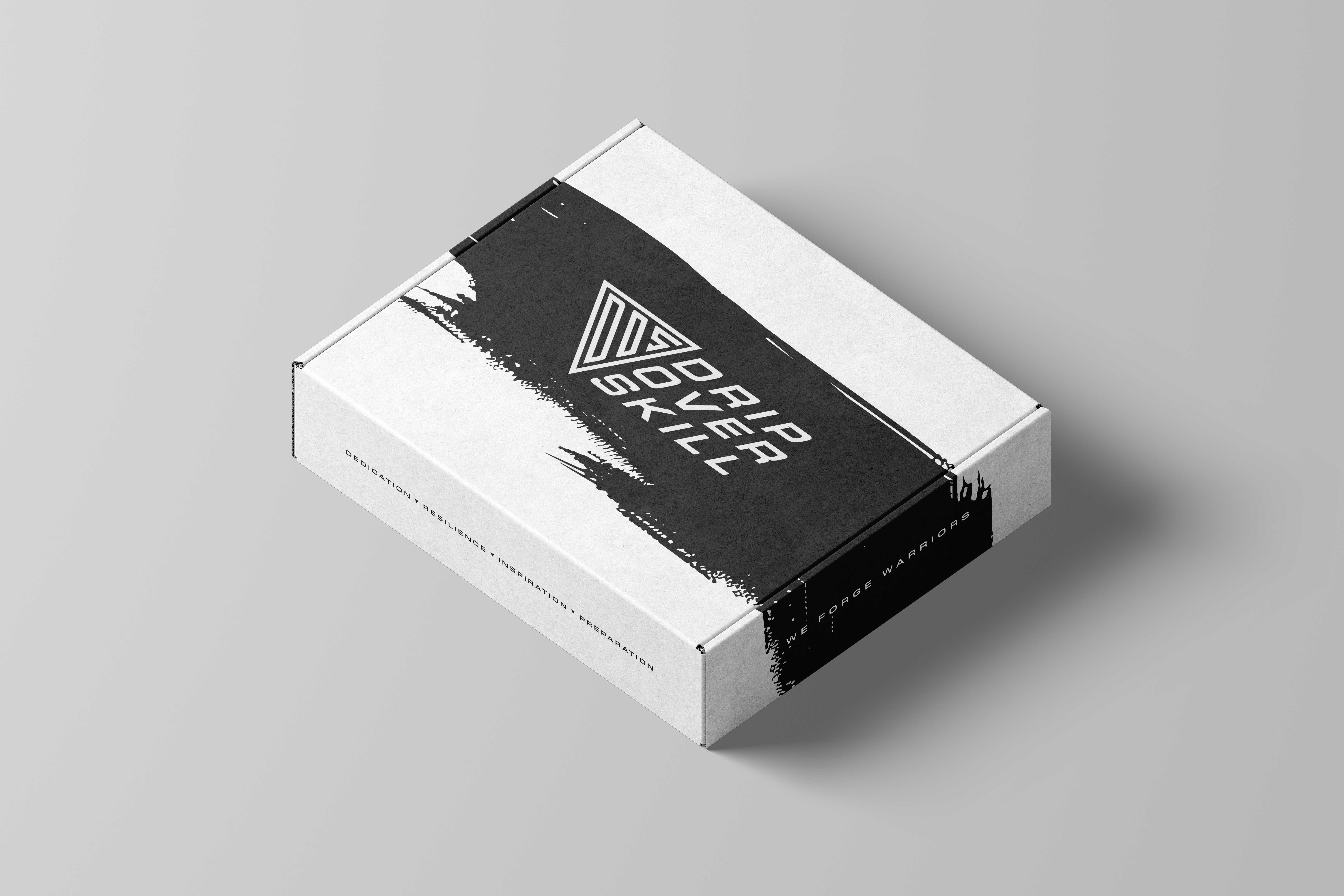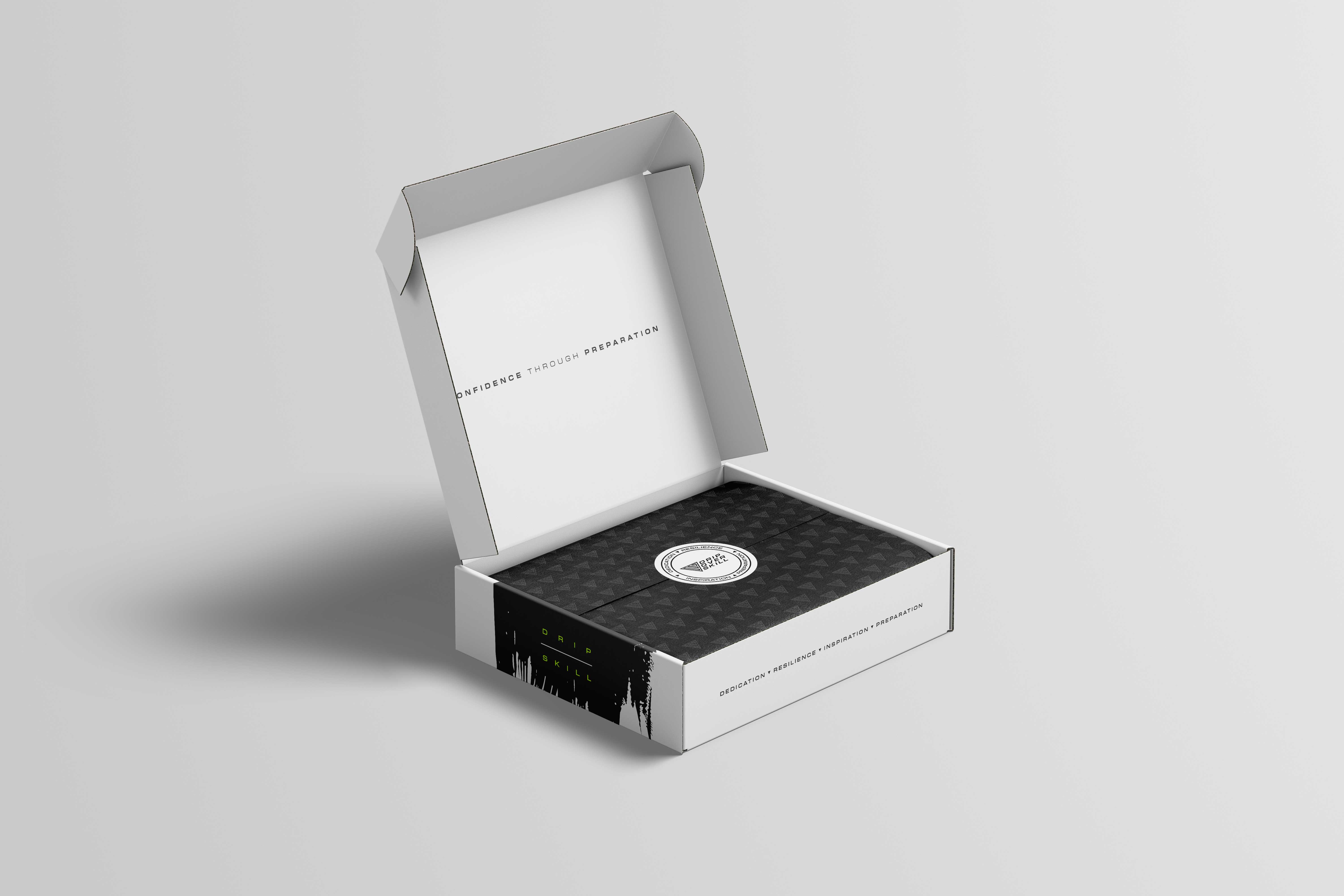 Every surface was treated as an opportunity to reinforce the brand, integrating DOS values and taglines throughout the exterior and inner flaps of the box. To extend the experience further, I proposed and designed custom branded tissue paper featuring a seamless DOS logomark pattern, along with a badge-style logo for the sealing sticker. The sticker incorporated the brand’s DRIP values: Dedication, Resilience, Inspiration and Preparation; all encircling the core DOS mark to create a consistent unboxing experience.