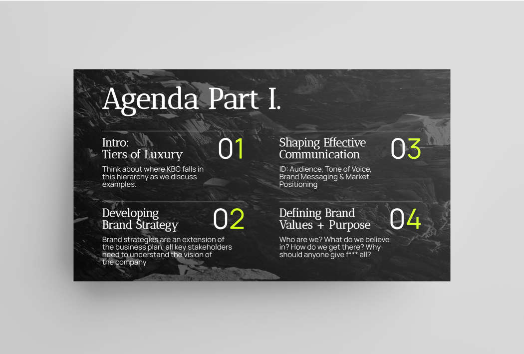 Given the size of our key stakeholder group, we conducted only a few comprehensive sessions to collectively discuss Keeler’s brand direction. To ensure efficiency, I meticulously crafted an extensive brand workshop and presentation, aiming for swift yet impactful progress. Securing democratic buy-in from all stakeholders was paramount, fostering a collaborative environment and preventing decisions from being made in isolation.