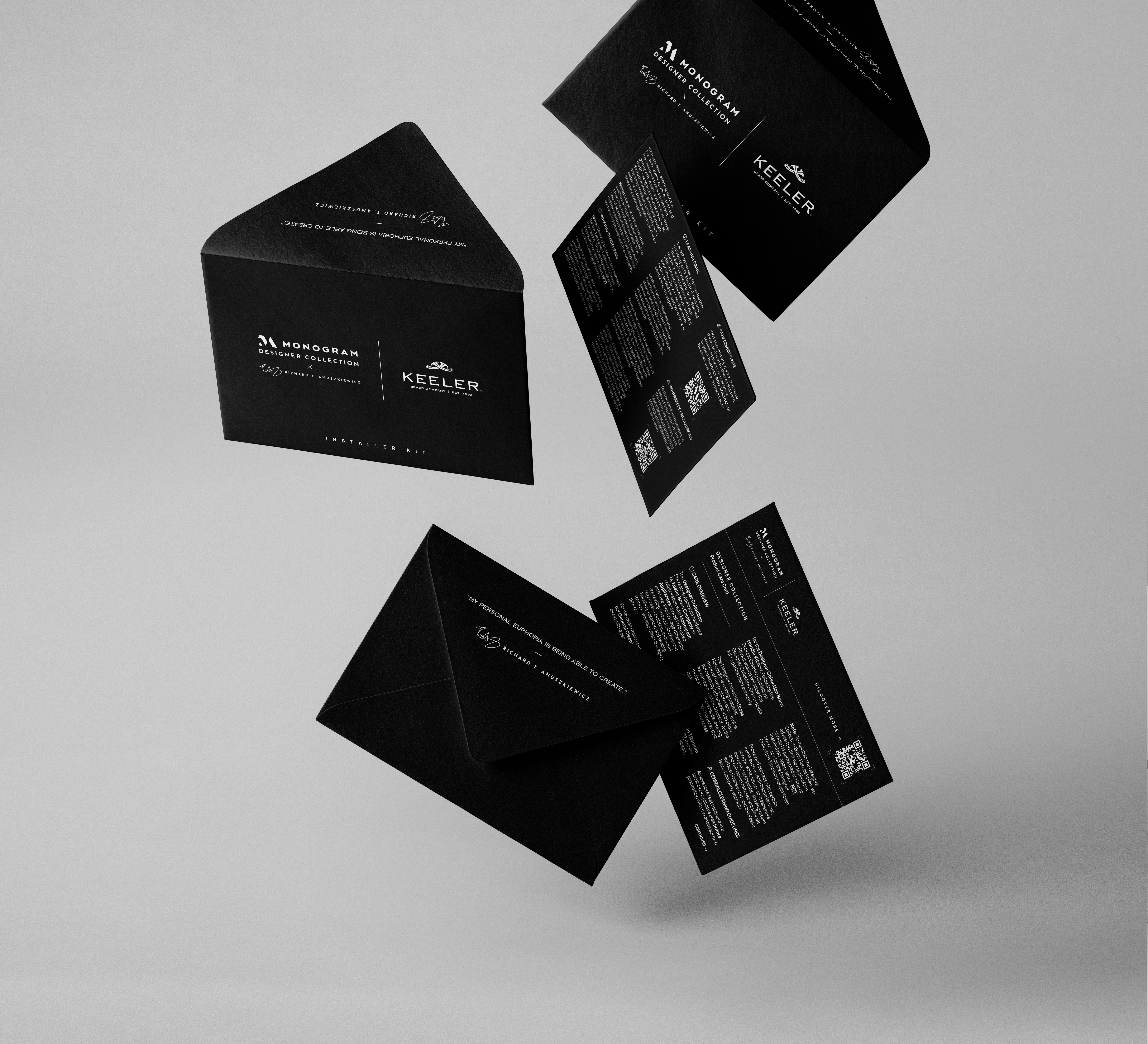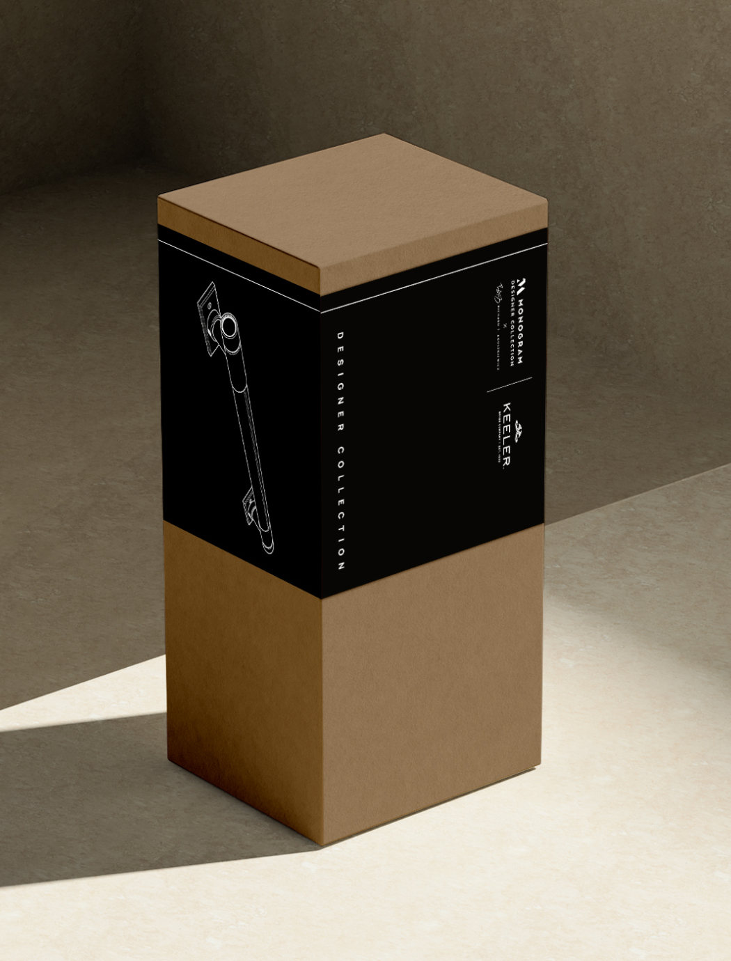 The Designer Collection by Monogram, in collaboration with renowned interior designer Richard T. Anuskiewicz and Keeler Brass Company, required a luxurious and cohesive packaging solution. The packaging kit needed to accommodate various components, including different box and label sizes, enveloped kits housing tri-folded instruction sheets, care cards, gloves, microfiber cloths, and installation tools. Each element had to work seamlessly together to create a unified and elegant presentation.