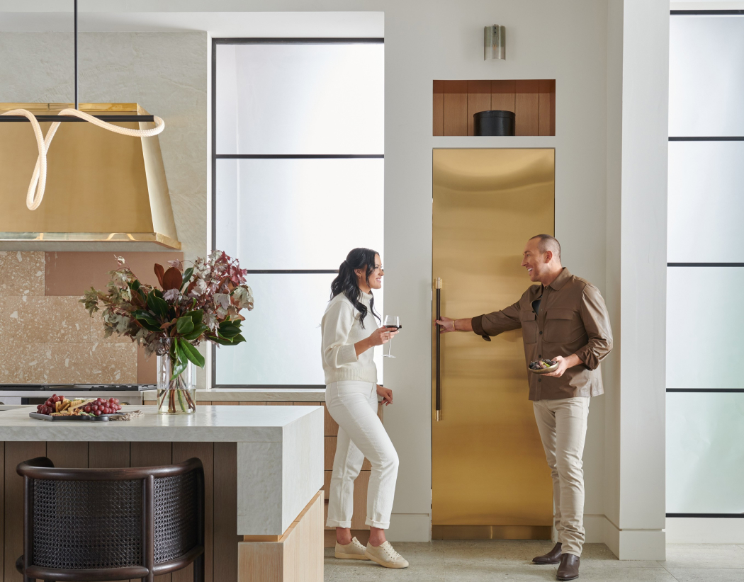 The Designer Collection is a luxury line of appliances by Monogram, created in collaboration with interior designer Richard T. Anuskiewicz and Keeler Brass Company. This collection features customized aftermarket Brass and Titanium finishes for hoods, refrigerator panels, knobs, and handles for ranges and column fridges.