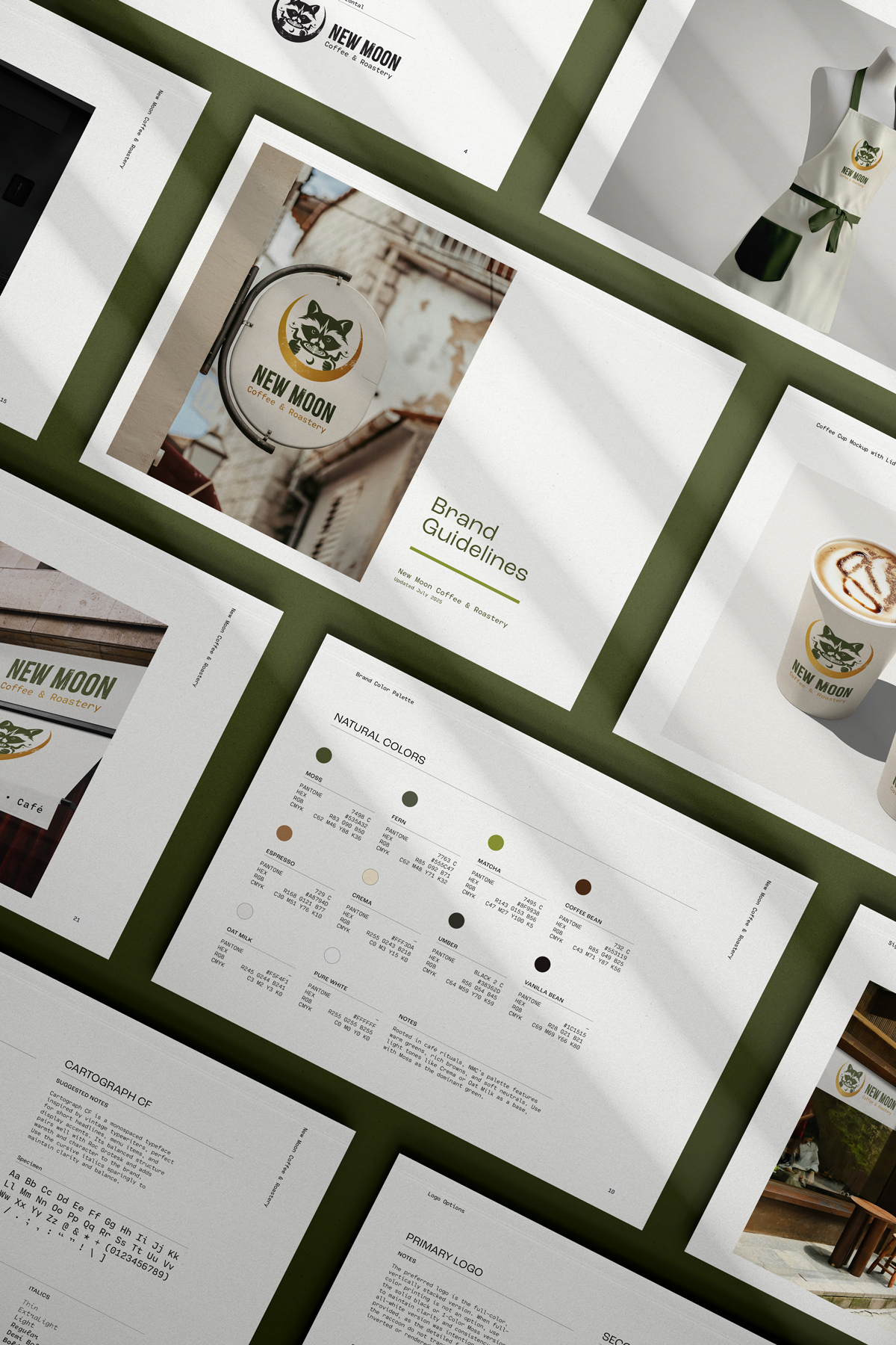 To help ensure the New Moon Coffee & Roastery brand launched with consistency, I created a comprehensive brand guide that established the foundation for its visual identity across multiple media types.