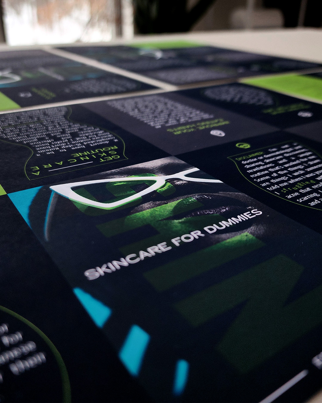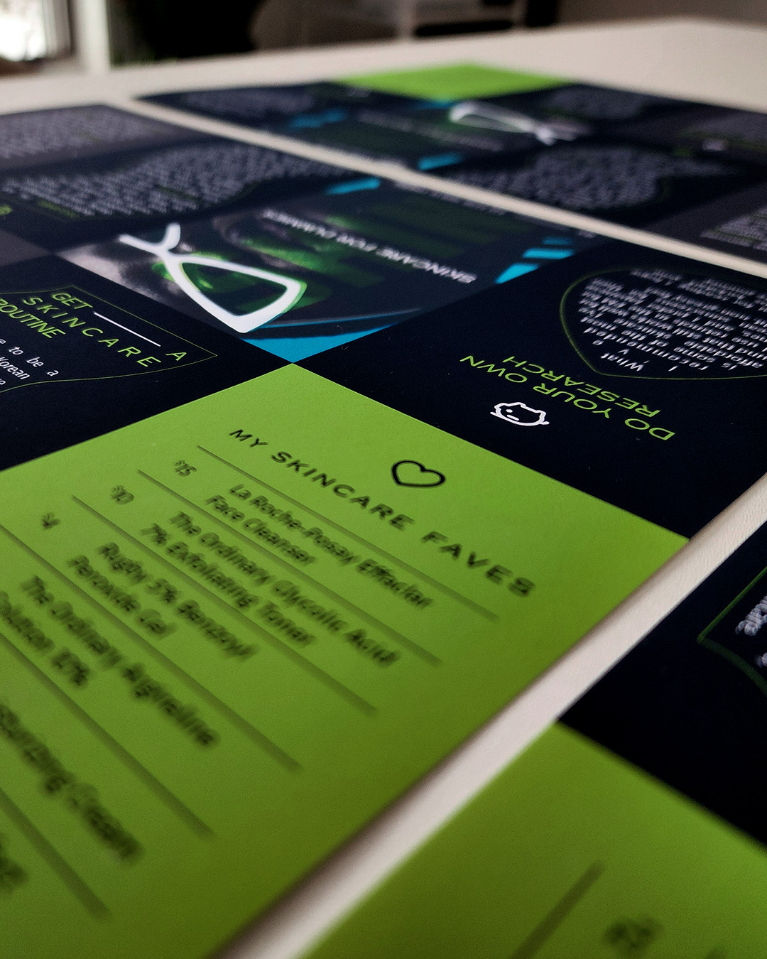 Taking great inspiration from the design of of the book, Snacky Tunes: Music is the Main Ingredient, Chefs and Their Music (2020) by Darin and Greg Bresnitz, I thought it'd be fun to experiment with it in a zine format. More visually striking than the traditional rectangular columns of text, creating the framing shapes in Illustrator than exporting back into InDesign makes for some fun design moments, elevating a what could be boring subject on skincare to be a little more interesting to gaze upon.