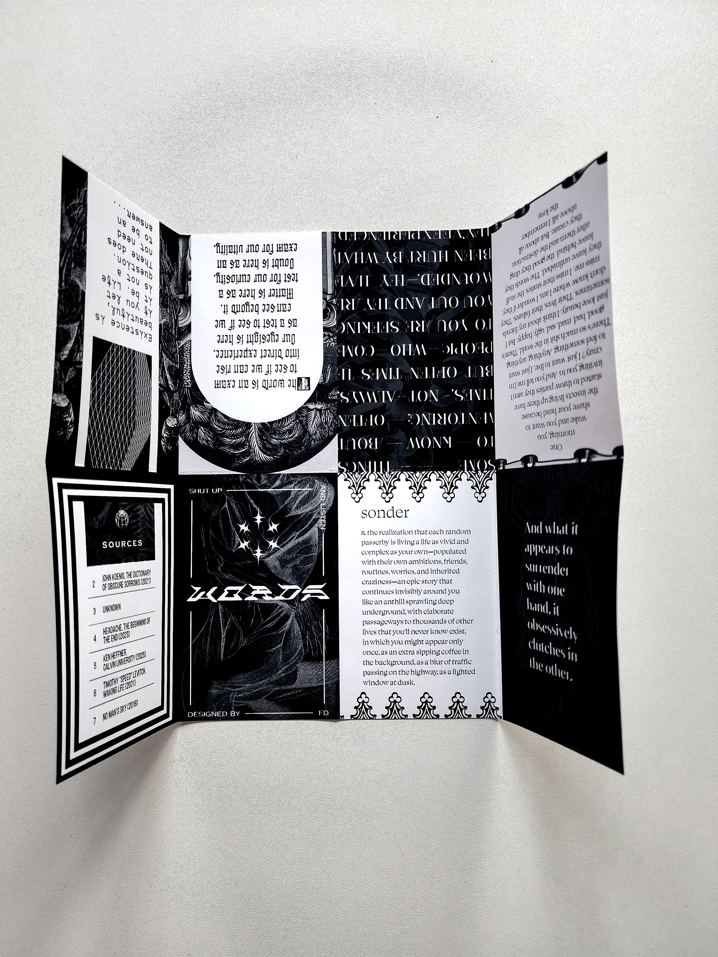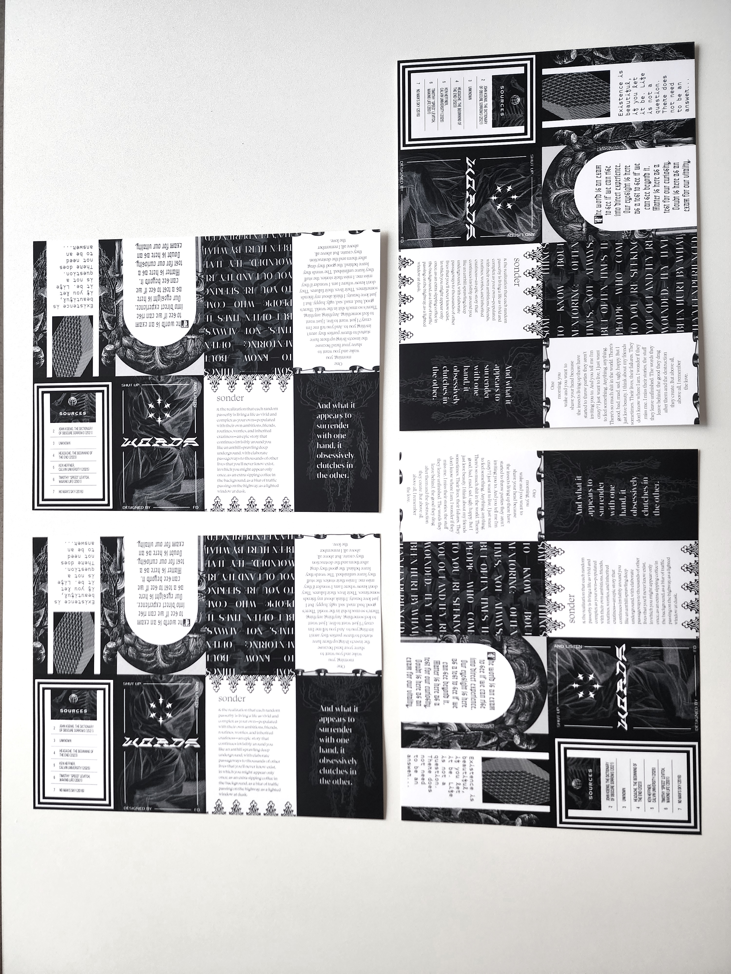 I started off with going with the basic, classic zine template, printed on a single page and folding into 8 smaller micro pages. No stapling needed, just one simple cut in the center and fold. To make things easy, I started off with some fairly simple topics of personal experiences with skincare, "SKIN" and "WORDS" to layout some of my favorite quotes, lyrics, and snippets of media and speech that have one way or another inspired me in some way. In this way I spent less time worrying about the content and more time designing.